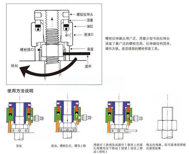 液壓螺栓拉伸器的工作原理可以簡單概括為:電動油泵輸出的高壓油通過高壓軟管輸送到液壓油缸。在高壓油的作用下,液壓缸產(chǎn)生拉伸力,并作用于被預(yù)緊的螺栓上。隨著活塞桿的繼續(xù)運動,螺栓被拉伸到一定長度,然后擰緊螺母,再松卸螺栓,完成螺栓的預(yù)緊工作。液壓螺栓拉伸器通過直接對螺栓施加軸向拉力,使螺母與法蘭面之間產(chǎn)生間隙,從而用較小的力將螺母旋緊。在釋放拉伸力時,雖然會有一定的載荷損失,但通過規(guī)范操作和經(jīng)驗積累,可以很好地控制這種損失,確保預(yù)緊力的準(zhǔn)確性。
