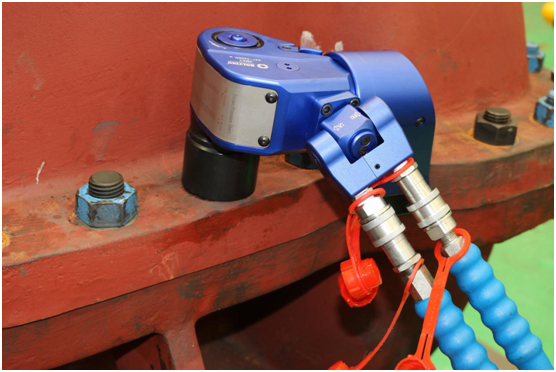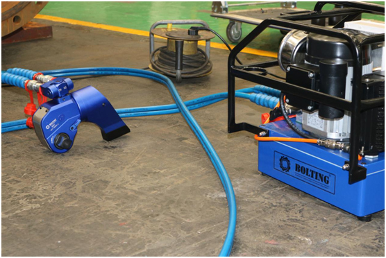 2、所有高精度設(shè)備,在螺栓終緊過程中,都應(yīng)該是對角或者四角施加扭矩,避免受力不均勻造成的法蘭變形或者密封受損,避免泄露,如采用電動扭矩扳手或者氣動扭矩扳手,需要兩個操作工程師用兩把電動扭矩扳手對螺栓進(jìn)行擰緊工作,時機(jī)配合等都需要相當(dāng)默契,那么四同步的情況下呢?成本相對于液壓扳手來說更高,采用液壓扳手則避免了這個問題,配置的電動液壓泵為四同步,同一臺動力源,不可能一臺扳手是50Mpa,另一臺48Mpa,后期有需要增加到四同步,僅需再配兩把液壓扳手和套筒即可,無需再購買液壓泵站。