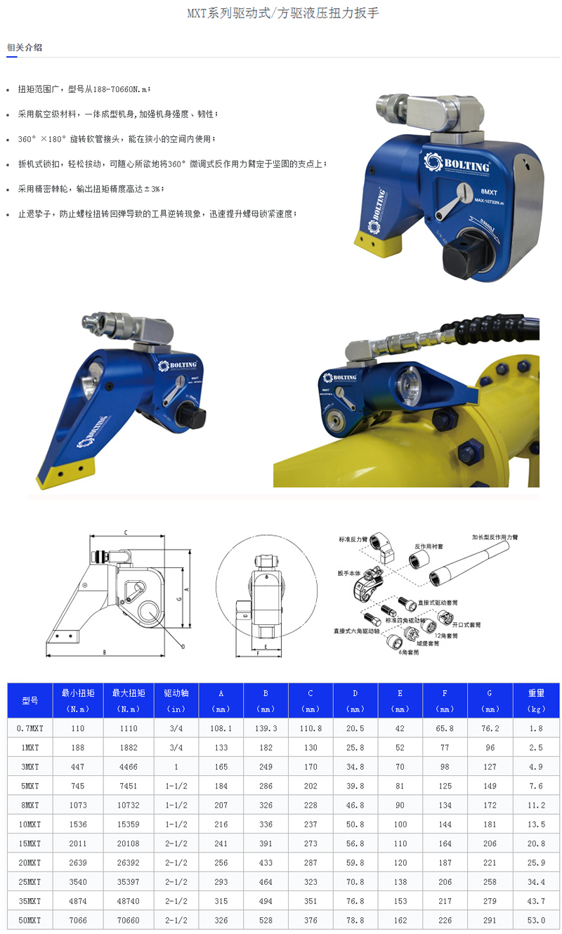 BOLTING品牌提供優(yōu)質(zhì)的工業(yè)工具組合:液壓扳手、螺栓拉伸器、液壓泵站、力矩倍增器、電動(dòng)扭矩扳手、氣動(dòng)扭矩扳手、液壓拉馬、液壓壓床、法蘭分離器、螺母破切器等多種類的產(chǎn)品,滿足各種客戶應(yīng)用要求。