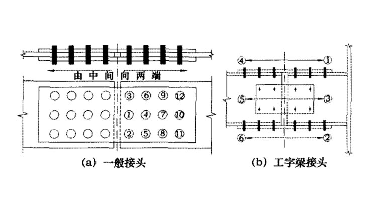 3、施擰時(shí),應(yīng)嚴(yán)格遵循先中間、后四邊,先接頭剛度大的部位后約束小的部位進(jìn)行施擰。圖4為一般節(jié)點(diǎn)接頭及工字梁接頭螺栓施擰順序 。