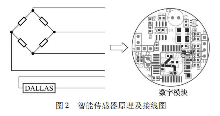 將模擬應(yīng)變式傳感器經(jīng)過組橋后直接將電橋的電壓模擬信號(hào)接入單片機(jī) CS5530 的模擬輸入端,通過 CS5530的A/D 轉(zhuǎn)換器將電壓信號(hào)轉(zhuǎn)換成數(shù)字信號(hào), 單片機(jī)對(duì)時(shí)鐘電路、復(fù)位電路、電源電路、串行通訊模塊、存儲(chǔ)模塊進(jìn)行控制,通過編程處理后按照一定的格式將數(shù)據(jù)通過 RS485 串行通訊接口輸出。采用DALLAS2401半導(dǎo)體芯片。該芯片在工廠生產(chǎn)時(shí),刻入經(jīng)檢測(cè)的64位注冊(cè)碼(8位家族碼+48位序列碼+8位CRC校驗(yàn)碼),因此可以保證沒有任何兩個(gè)器件的注冊(cè)碼是相同的。采用低成本 TSOC 表面貼封裝,方便裝在傳感器插頭或接線腔中。原理圖如圖2所示。
