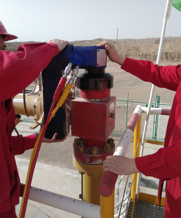 經(jīng)過我們該區(qū)域的現(xiàn)場銷售工程師勘察測量做出解決方案,BOLTING(博霆)為之專門定制的天然氣單井固定式節(jié)流閥專用液壓扭矩扳手解決了困擾他們難題,得到了用戶的認可,施工現(xiàn)場如下:
